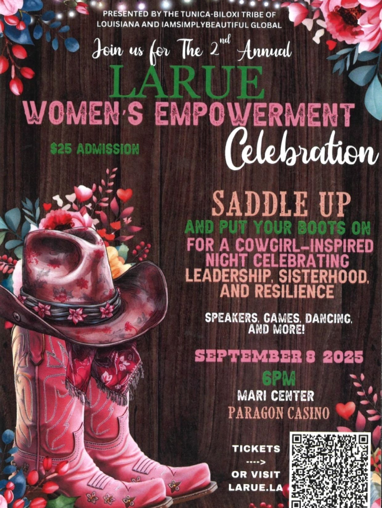 Join us for the 2nd Annual LARUE Women’s Empowerment Celebration, proudly presented by the Tunica-Biloxi Tribe of Louisiana and IAMSIMPLYBEAUTIFUL Global! This cowgirl-inspired evening is all about leadership, sisterhood, and resilience—featuring dinner, speakers, games, dancing, and more!